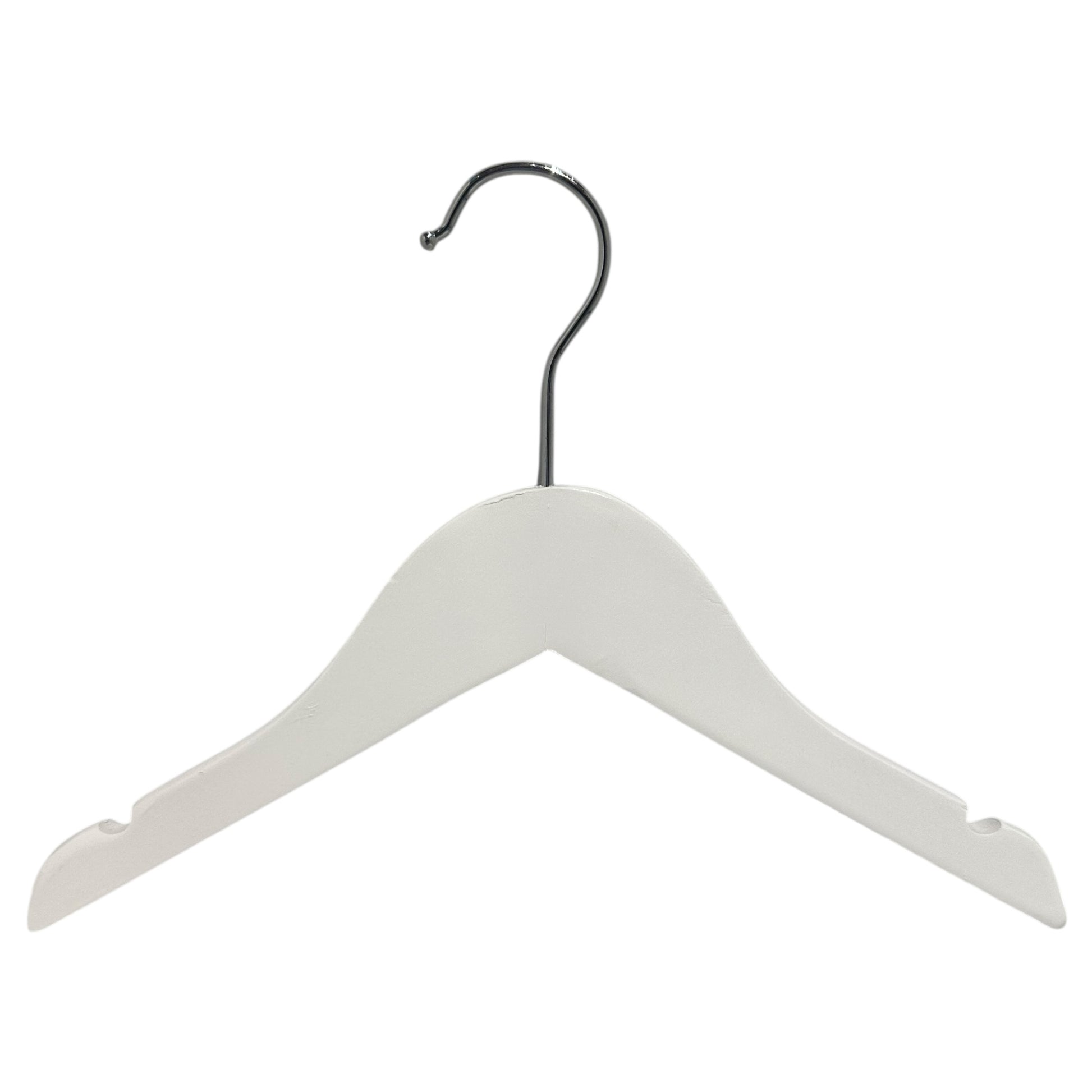 Baby clothing hanger with notch made of wood and a 3 mm shiny hook. The hanger is perfect for children's and baby clothes and has a notch to hold skirts. Hanger dimensions: W 27 cm. Colors: White (4012-01) Natural (4012-59) Black (4012-04). Packed in 50 pcs. Price shown per piece.