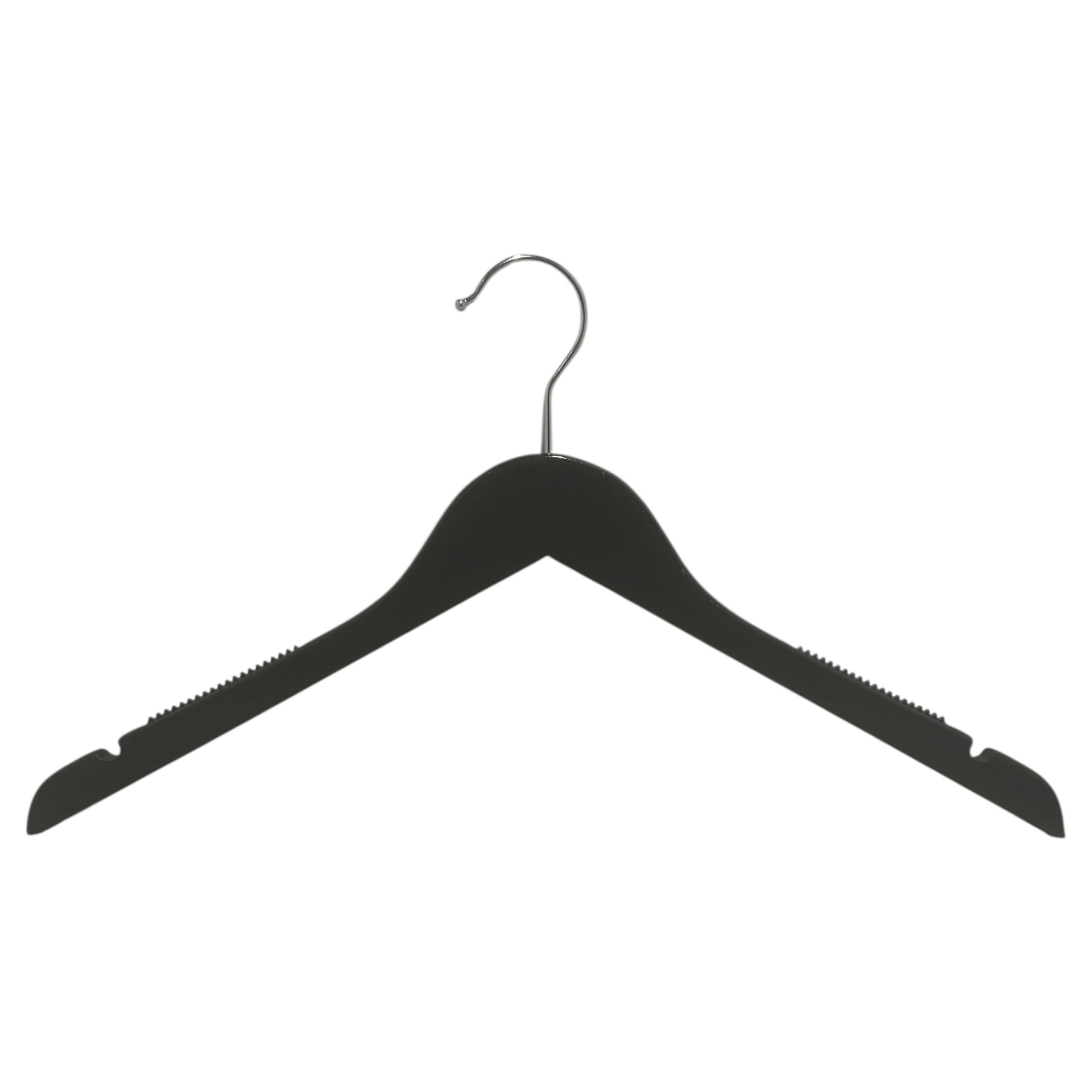 Wood hanger, solid, flat, adult, with rubber and notch, without bar, black, 12 mm thick, 45 cm