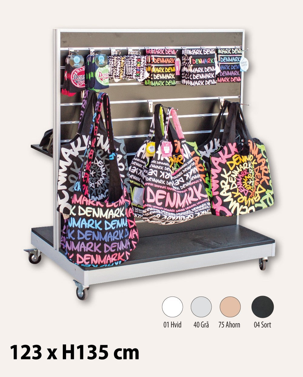 Fleksibel og mobil gondol til effektiv varepræsentation. Denne dobbeltsidede gondol med rillepanel er et praktisk og alsidigt salgsdisplay til den professionelle butik. Gondolen er opbygget omkring et solidt metalstel og fås med rillepaneler i flere farver, så den nemt kan tilpasses dit visuelle udtryk og brandidentitet. Det tosidede design gør gondolen ideel til placering midt på gulvet, hvor du kan præsentere varer fra begge sider og maksimere salgsarealet. De integrerede hjul sikrer nem mobilitet, så du hurtigt og enkelt kan ændre layoutet eller flytte inventaret ved sæsonskift, kampagner eller rengøring. Tophylde og beslag kan tilkøbes separat, hvis du ønsker ekstra fleksibilitet i varepræsentationen. Mål: B 120 x H 135 cm Rilleafstand: 10 cm Alu-farvet metal stel Sendes u samlet