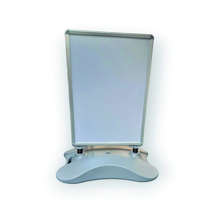 Stormmaster street sign for posters in size 70 x 100 cm. This street sign is mounted on springs that provide the necessary flexibility, especially in windy conditions, and the base is made of impact-resistant plastic that can be filled with either water or sand. To protect against frost damage, it can also be filled with antifreeze to prevent the water from freezing. Two wheels are fitted to the sign, allowing it to be tilted and easily moved as needed. Two non-reflective PET panels are included. Dimensions: H133 x 98 x 61 cm. Poster size 70 x 100 cm. Aluminum-colored / gray. New PET panels can be purchased under item no.: 7028-00