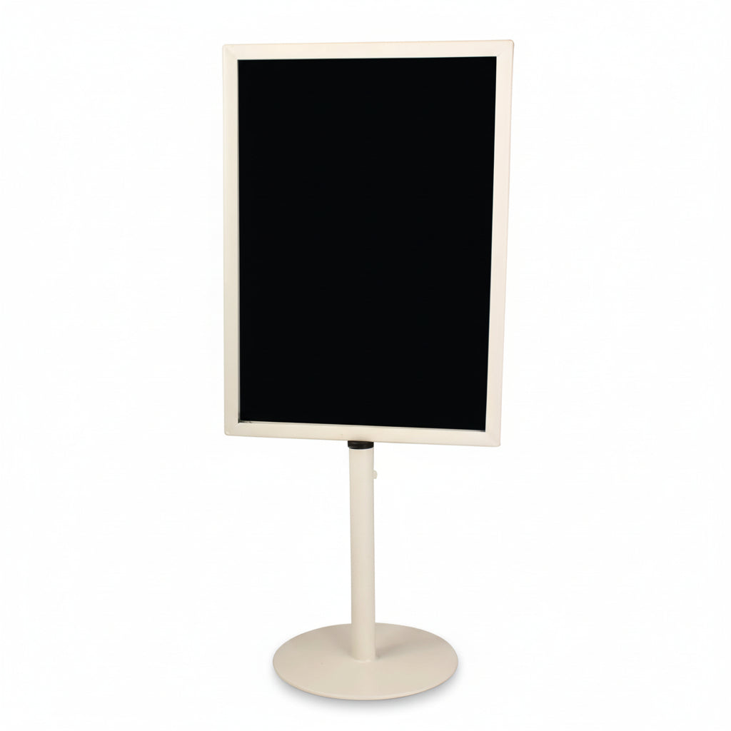 Our classic metal menu holder on a sturdy round metal base. Our menu or sign holder is suitable for any type of signage. Whether it’s a laminated sign, a sign with plastic pockets, paper, or cardboard, it can be inserted into our menu holder. The base has a fixed height of 19 cm, but it can be extended by up to 15 cm with an optional extender. We also recommend purchasing plastic pockets to protect the paper sign from wear and dirt. The galvanized model is especially suitable for outdoor sales counters, as it withstands various weather conditions.