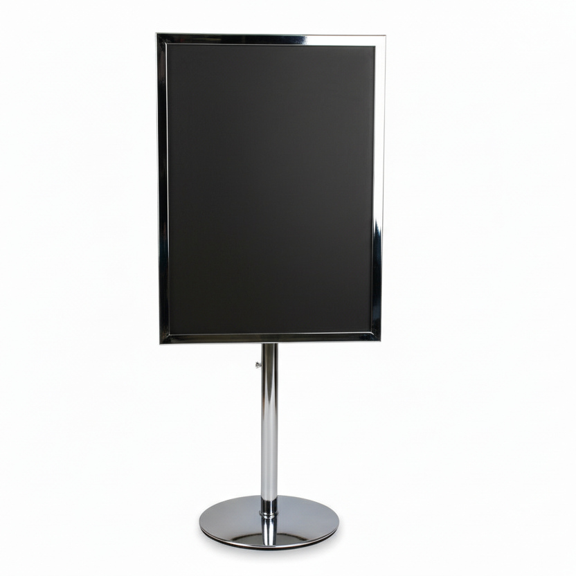 | Our classic menu holder in metal on a sturdy round metal base. Our menu or sign holder is suitable for any kind of signage. Whether it's a laminated sign, a sign with plastic pockets, paper or cardboard, it can be inserted into our menu holder. The base has a fixed height of 19 cm but can be extended by up to 15 cm with the purchase of an extender. We also recommend buying plastic pockets to protect the paper sign from wear and dirt. The galvanized model is especially suitable for outdoor sales counters, as it withstands various weather conditions. | Regular price