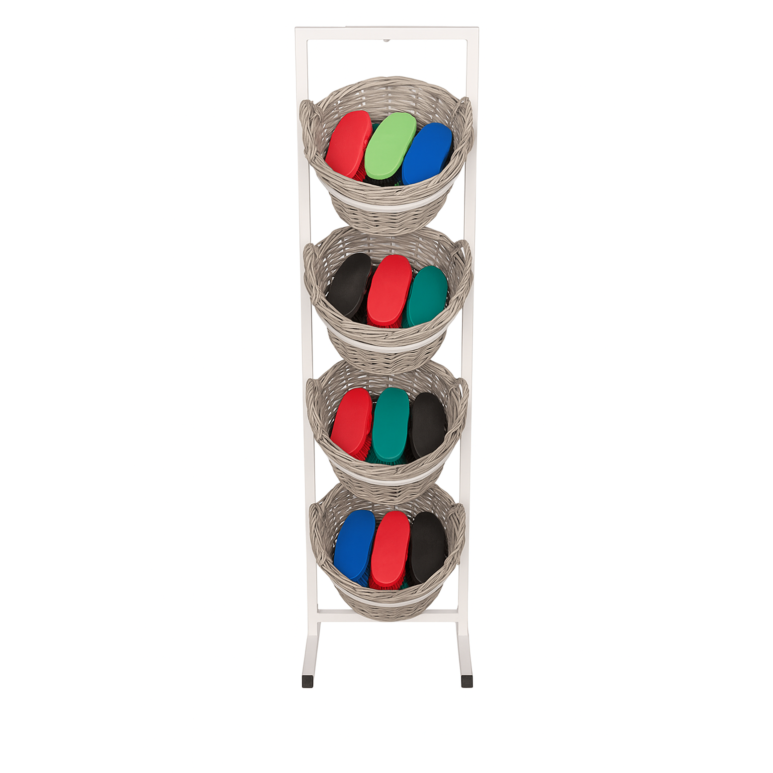 Basket stand with 4 baskets for your goods. Option for A4 or A3 metal sign at the top. The basket stand is supplied with level feet. A wheel set can be purchased so the stand can be moved and make cleaning easier. Dimensions: W 45 x H 173 cm. Base: W 45 x D 40.5 cm. The basket has a worn look in the style of our Heritage fixture series. The basket comes with a plastic insert. The insert is secured with a small wire that can be easily removed.