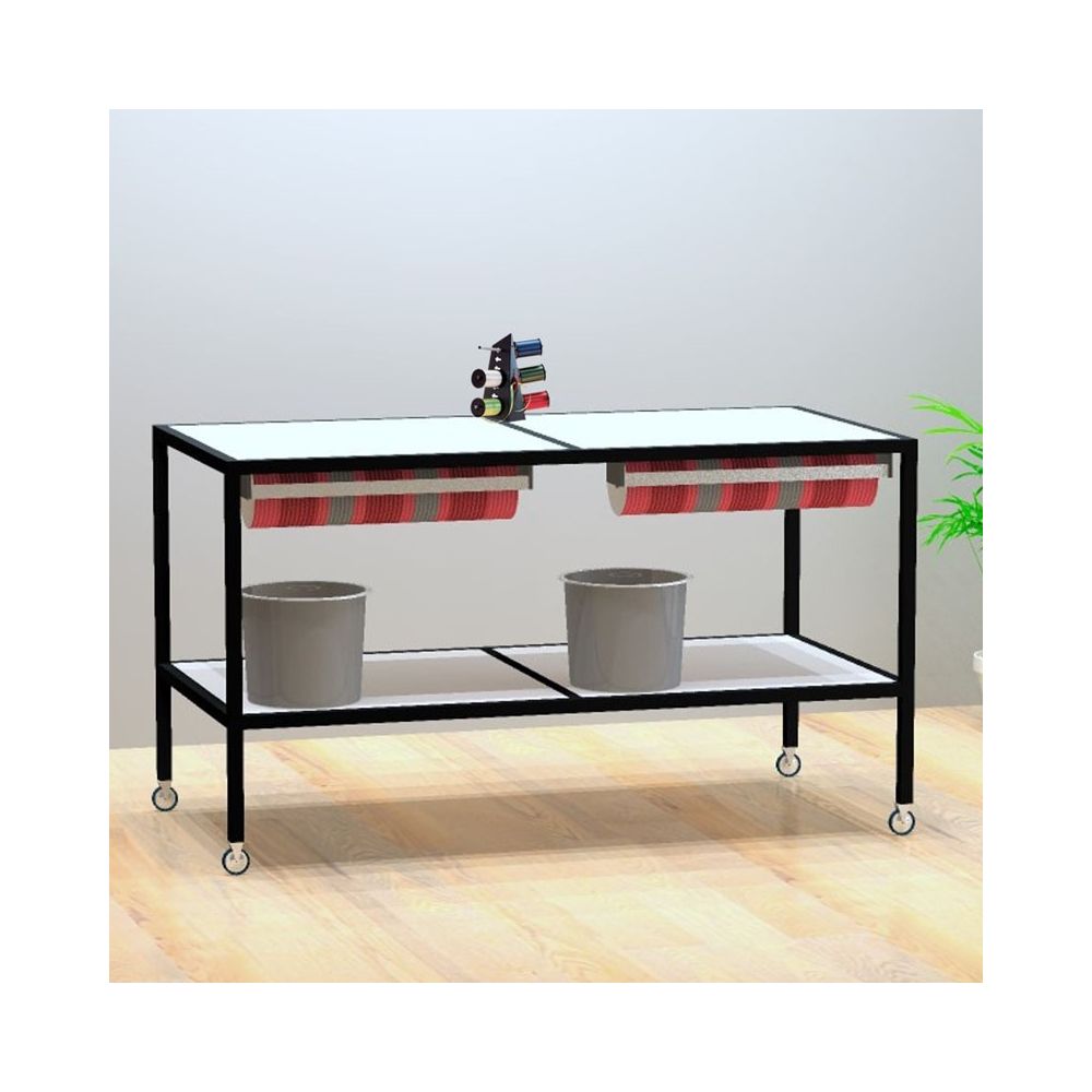 | Double packing table in the Luton model - perfect for Christmas shopping. Practical packing table with wheels. Stable table with undershelves. Set consists of Luton packing table with wheels, 2 paper rolls 60 cm (Item no.: D5050-o) and a tape dispenser. The table has a black metal frame and white melamine tabletops. Dimensions: 160 x 80 x H80 cm (+ wheels approx. 8–10 cm). 75 mm rubber wheels / 2 wheels with brake. Delivered unassembled. Shown with different wheels in the picture, but the table comes with quality rubber wheels. | Regular price