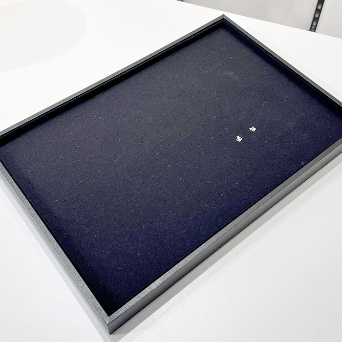 Smykkebakke til ørestik. Mål:35 x 24 x 3 cm. Sort flock