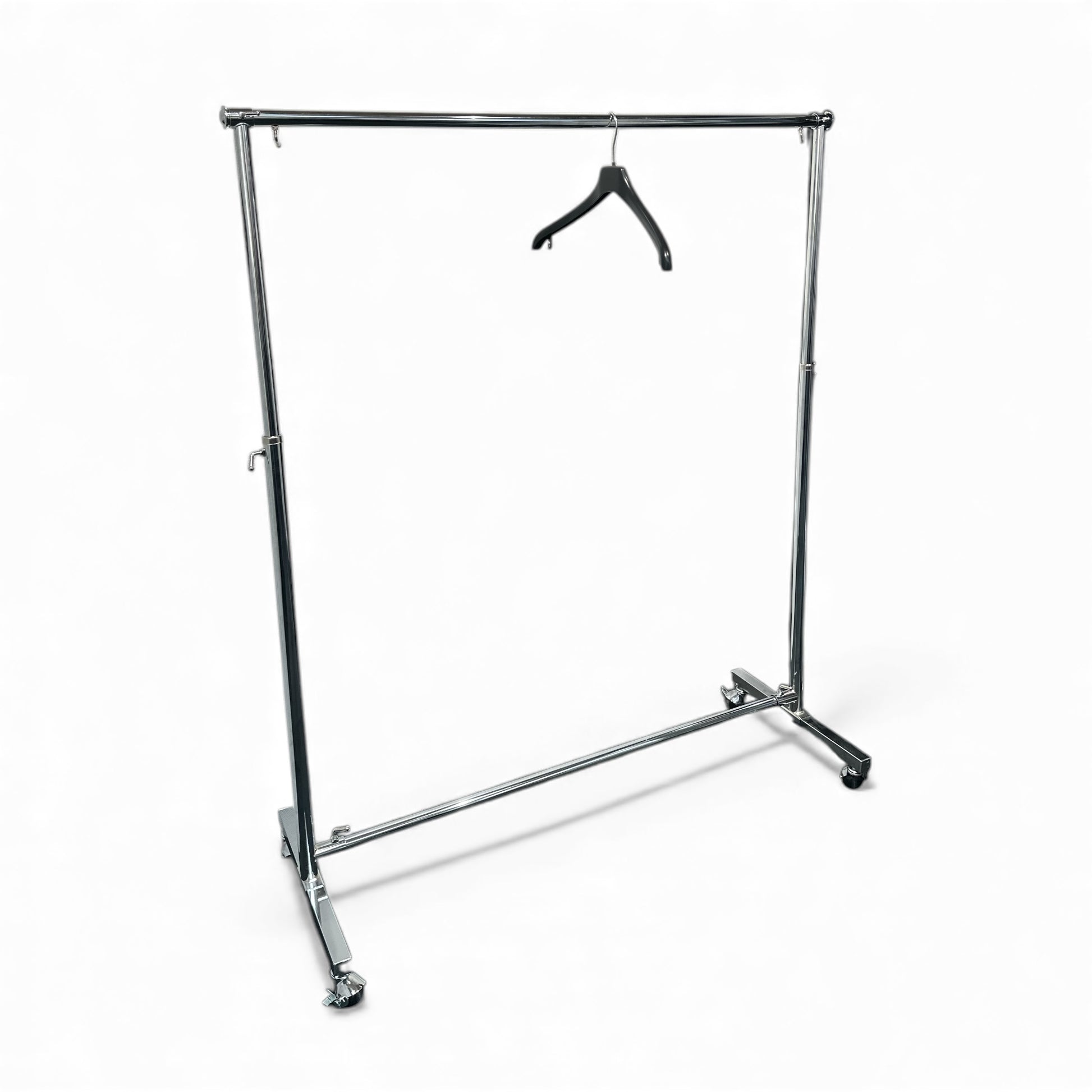 Spacey tøjstativ – konfektionsstativ med kuglehjul, derfra Spacey :-) Stativet kan nemt tilpasses dine behov. Bredden justeres fra 120 til 220 cm, så du både kan bruge det til små og større kollektioner. Højden er trinløs, da stativet justeres med spændeskruer – du kan derfor sætte højden præcis dér, hvor det passer, uden at være bundet af faste stop. De 50 mm plast kuglehjul gør det let at flytte stativet rundt, selv når der er godt med tøj på. Hjulene ruller roligt og stabilt. Mål: Bredde: 120–220 cm (justerbar) Højde: 132–200 cm (trinløs højdejustering med spændeskruer) Dybde: 46 cm 30 x 30 mm runde rør i krom 50 mm plast kuglehjul Krom