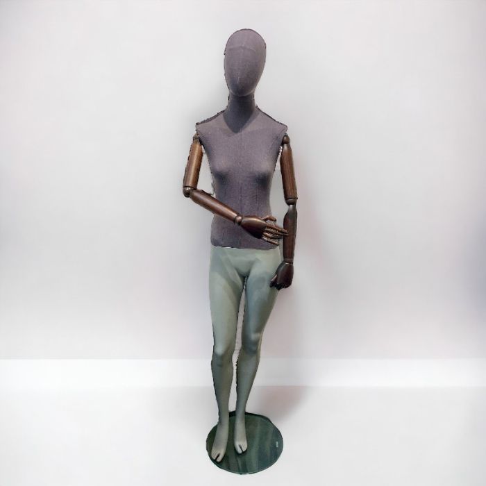 Vintage damemannequin med torso og hoved i gråt stof. Hovedet kan drejes og tages af. Brune træarme Ben i lys grå. H 178 cm.
